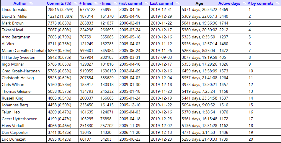 像以往一样,Linus Torvalds 依然是 Linux 源代码树上最高产的贡献者。除了他之外,Linux 内核源码树上,排名靠前的代码贡献者分别是 David S. Miller、Arnd Bergmann、Christoph Hellwig、Lee Jones 和 Jakub Kicinski 等知名的长期内核贡献者。