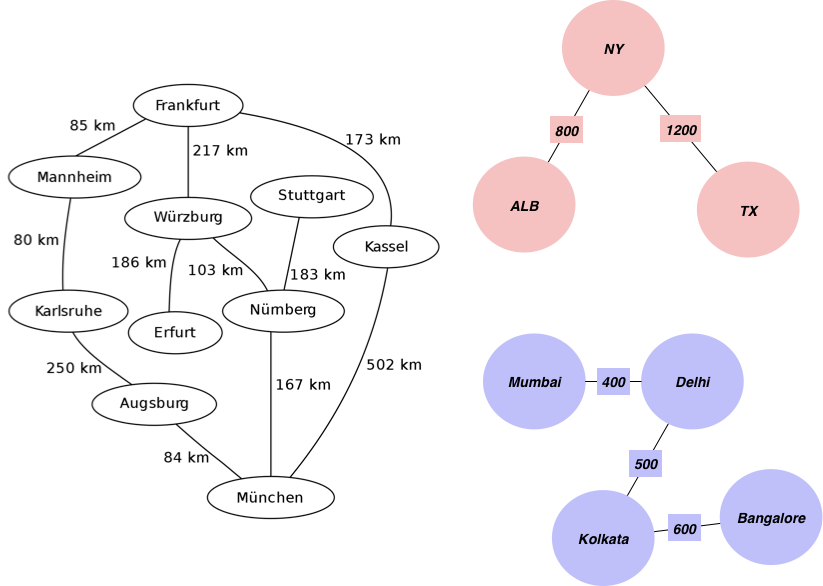 edgelist = [['Mannheim', 'Frankfurt', 85], ['Mannheim', 'Karlsruhe', 80], ['Erfurt', 'Wurzburg', 186], ['Munchen', 'Numberg', 167], ['Munchen', 'Augsburg', 84], ['Munchen', 'Kassel', 502], ['Numberg', 'Stuttgart', 183], ['Numberg', 'Wurzburg', 103], ['Numberg', 'Munchen', 167], ['Stuttgart', 'Numberg', 183], ['Augsburg', 'Munchen', 84], ['Augsburg', 'Karlsruhe', 250], ['Kassel', 'Munchen', 502], ['Kassel', 'Frankfurt', 173], ['Frankfurt', 'Mannheim', 85], ['Frankfurt', 'Wurzburg', 217], ['Frankfurt', 'Kassel', 173], ['Wurzburg', 'Numberg', 103], ['Wurzburg', 'Erfurt', 186], ['Wurzburg', 'Frankfurt', 217], ['Karlsruhe', 'Mannheim', 80], ['Karlsruhe', 'Augsburg', 250],["Mumbai", "Delhi",400],["Delhi", "Kolkata",500],["Kolkata", "Bangalore",600],["TX", "NY",1200],["ALB", "NY",800]]
