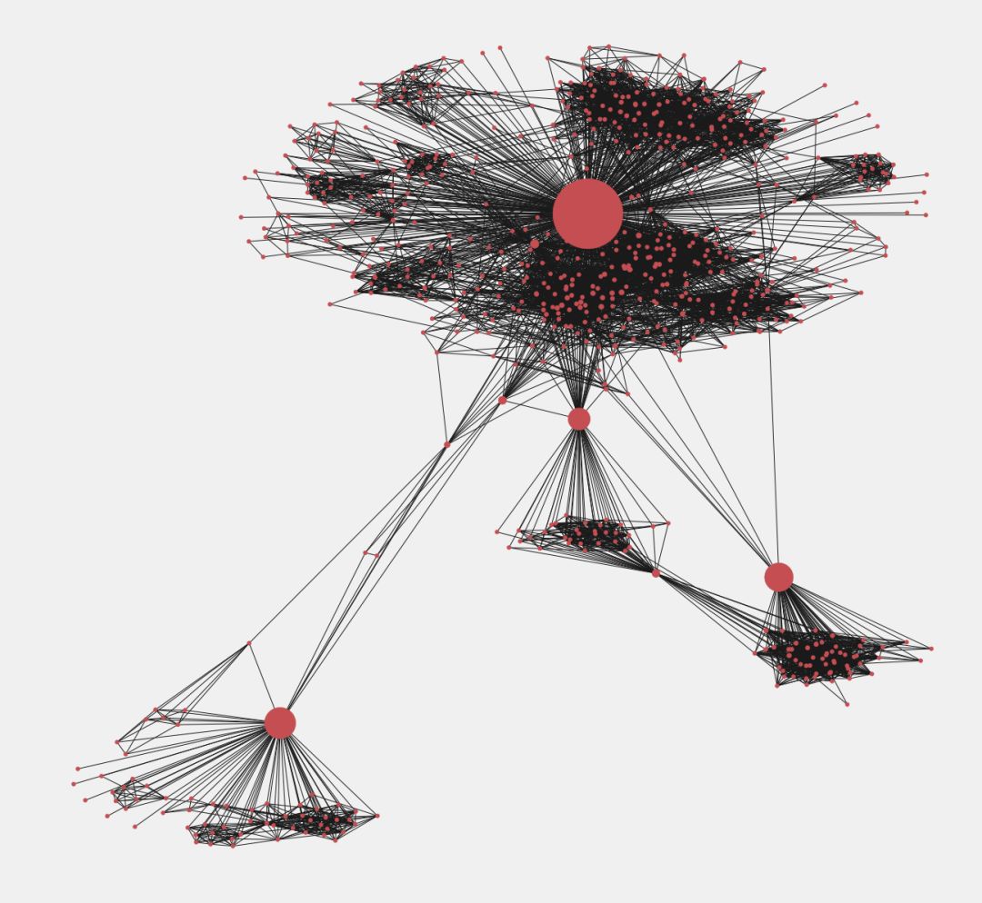 如上图所示,节点的尺寸大小和介数中心性的大小成正比。具有较高介数中心性的节点被认为是信息的传递者,移除任意高介数中心性的节点将会撕裂网络,将完整的图打碎成几个互不连通的子图。