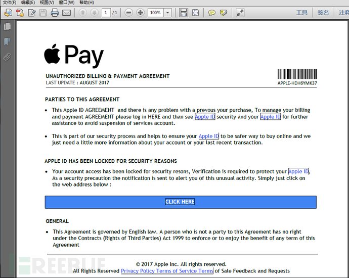 pdf钓鱼攻击案例:与其他垃圾邮件广告系列不同,我们在钓鱼攻击中看到的PDF不包含恶意软件或漏洞利用代码。相反,攻击者会依制作高仿制的钓鱼网页,如果此时你警惕性不高,将会泄露个人的敏感信息。如下图点击链接,你将进入一个假的Apple登录页面,该页面要求你输入Apple ID 以及你的密码信息。