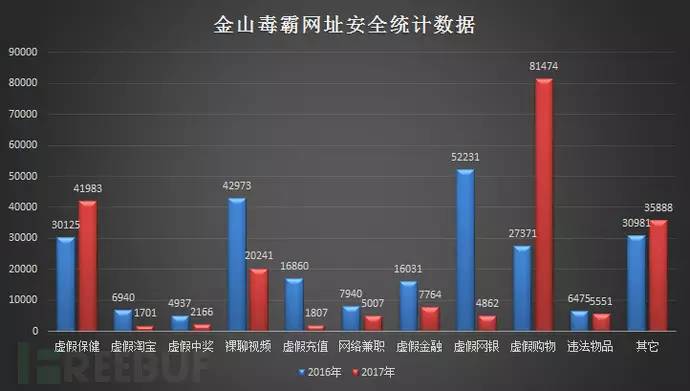 根据金山毒霸网址安全中心提供的数据显示,2017年虚假购物平台的钓鱼攻击,呈翻倍增涨趋势。造成了严重的网络交易安全隐患,广大网民的利益也因此受到了严重损害,不法分子利用虚假购物网站直接盗取用户的支付宝或银行账号或者以超低价格设置消费陷阱的山寨购物网站,以低价、打折等吸引买家上当。其危害性之大,不言而喻