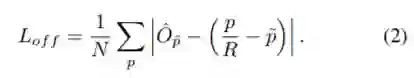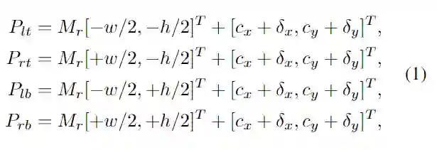 其中(cx,cy)和(δx,δy)是中心点和偏移量预测;(w,h)是尺寸预测; Mr是旋转矩阵;Plt,Prt,Plb和Prb是定向边界框的四个角点。按照CenterNet的回归任务,本文使用L1损失进行旋转角度的回归: