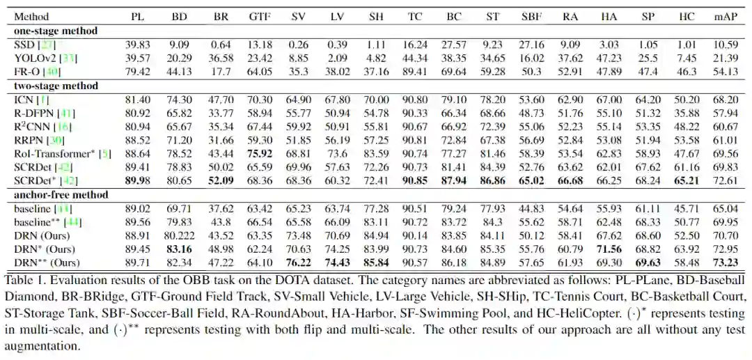 表1显示了DOTA测试集上比较。其他方法都是基于anchor的,并且大多数基于Faster R-CNN的框架。相比之下,本文的方法是anchor-free的。与baseline相比,本文的方法在mAP方面实现了3.3%的增长。