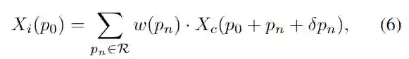 其中Mr(θ)是公式(1)中定义的旋转矩阵。对于输出特征图Xi中的每个位置p0,有: