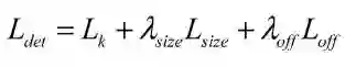 其中,Lk为关键点的损失,使用了Focal Loss的形式;Lsize为宽与高的预测损失,Loff为偏移预测的损失;Lsize与λoff是为了平衡各部分损失而引入的权重。