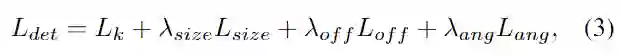 其中Lk,Lsize和Loff是中心点识别,尺度回归和偏移回归的损失,与CenterNet相同;λsize,λoff和λang是常量,实验中都设为0.1。