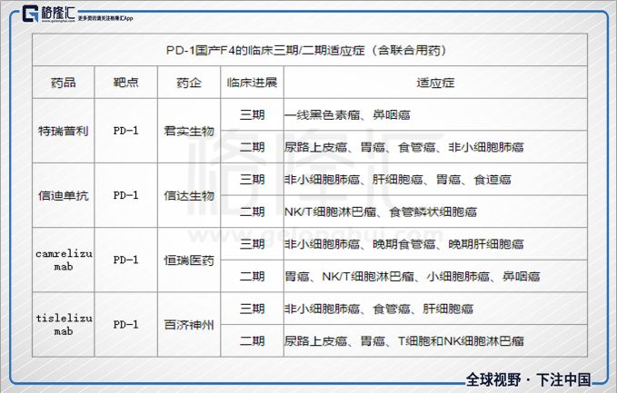 就君实生物的PD-1来说,处于临床三期的适应症有一线黑色素瘤和鼻咽癌,处于临床二期的有尿路上皮癌、胃癌、食管癌和非小细胞肺癌等。