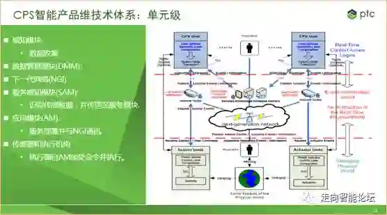 在CPS智能产品维,其单元级的技术体系要素如图中所示。该部分能力体现在产品上,形成产品的智能化特性。在该类智能产品的实现层面,一方面需要产品本身的技术突破,另一方面需要工业软件等使能技术,以支持上述智能特性的设计、仿真验证、集成测试等。