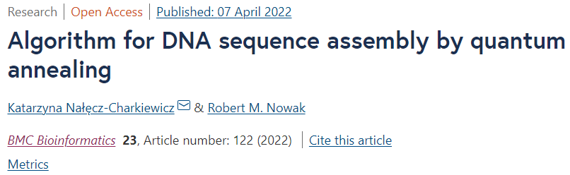 华沙理工大学的研究人员提出了从头组装算法的概念证明,使用基因组信号处理方法,通过计算 Pearson 相关系数来检测 DNA 读数之间的重叠,并将组装问题制定为优化任务(旅行推销员问题)。将在经典计算机上执行的计算与通过结合 CPU 和 QPU 计算的混合方法获得的结果进行比较。为此,使用了 D-Wave 的量子退火器。