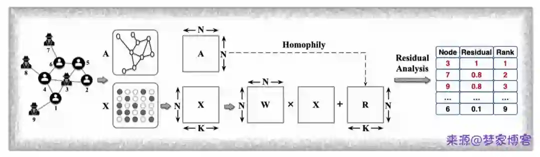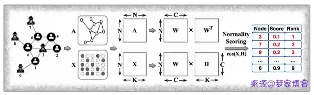 Accelerated local anomaly detection 主要检测社团异常点,主要基于非负矩阵分解的方法计算节点属性特征的相似性来判定节点异常程度。主要架构如下所示