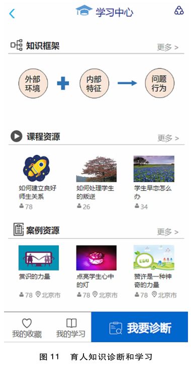 学习中心模块以帮助用户了解和掌握育人知识为基本出发点,以知识学习为主要形式。问题解决经验需要进一步转化为知识才能实现真正的触类旁通,知识的掌握对于提升育人能力至关重要。本模块以促进用户的知识性学习为主,用户可以通过查看育人知识框架、课程资源、案例资源等学习相关知识,也可以进行自我诊断,客观分析自身的育人知识掌握上的优劣势,并有针对性地根据相关推荐资源弥补弱势知识点(见图11)。此外,学生的问题行为、与该问题行为相关的内外部因素、导致问题行为发生的最本质诉求之间可通过关联关系形成育人知识图谱(见图12),帮助用户从根本上把握育人本质,提升育人能力。