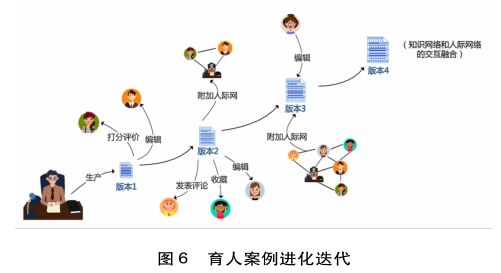 第三,对于案例的进化性和生成性特征,一方面,育人案例可通过社会信任计算和编辑贡献帮助案例内容加以完善和进化生成(见图6),用户可以对案例内容进行评价打分,还可以编辑案例贡献自己的观点,而系统将审核根据用户的信任评价和贡献,并合理地纳入案例进化机制中,使育人案例进化和版本迭代。而迭代后的版本中用户可以重新参与编辑、评论、收藏等,案例也将在已有的交互基础上叠加人际网络,且随用户互动的不断增加而丰富,最终实现育人案例知识网络和人际网络的交互融合。