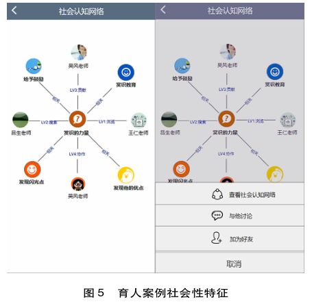 其次,对于案例的社会性特征,从联通主义学习理论的视角看,用户与案例的交互过程不仅是人与学习内容的交互,还存在人与学习内容相关的人的交互,也就是说,用户的学习不仅是建构知识网络的过程,还是基于知识建构社会网络的过程。育人领域尤为如此。育人问题有明显的个体特征,同一问题在不同个体身上表现不同,且因不同用户对育人的理解不同而形成的问题解决方式不同。通过连接育人案例背后的人,用户可以建立与该案例相关的社会网络,在与其他用户的社会化交往过程中了解问题解决方式,以激发新的思考和创新。本研究育人案例的社会性特征设计如图5所示。用户可以通过查看育人案例背后的社会认知网络了解相关案例,还可以了解与该案例相关的用户及其贡献程度,并任意选择开展会话交流,建立社会网络,促进对育人问题的理解和把握。