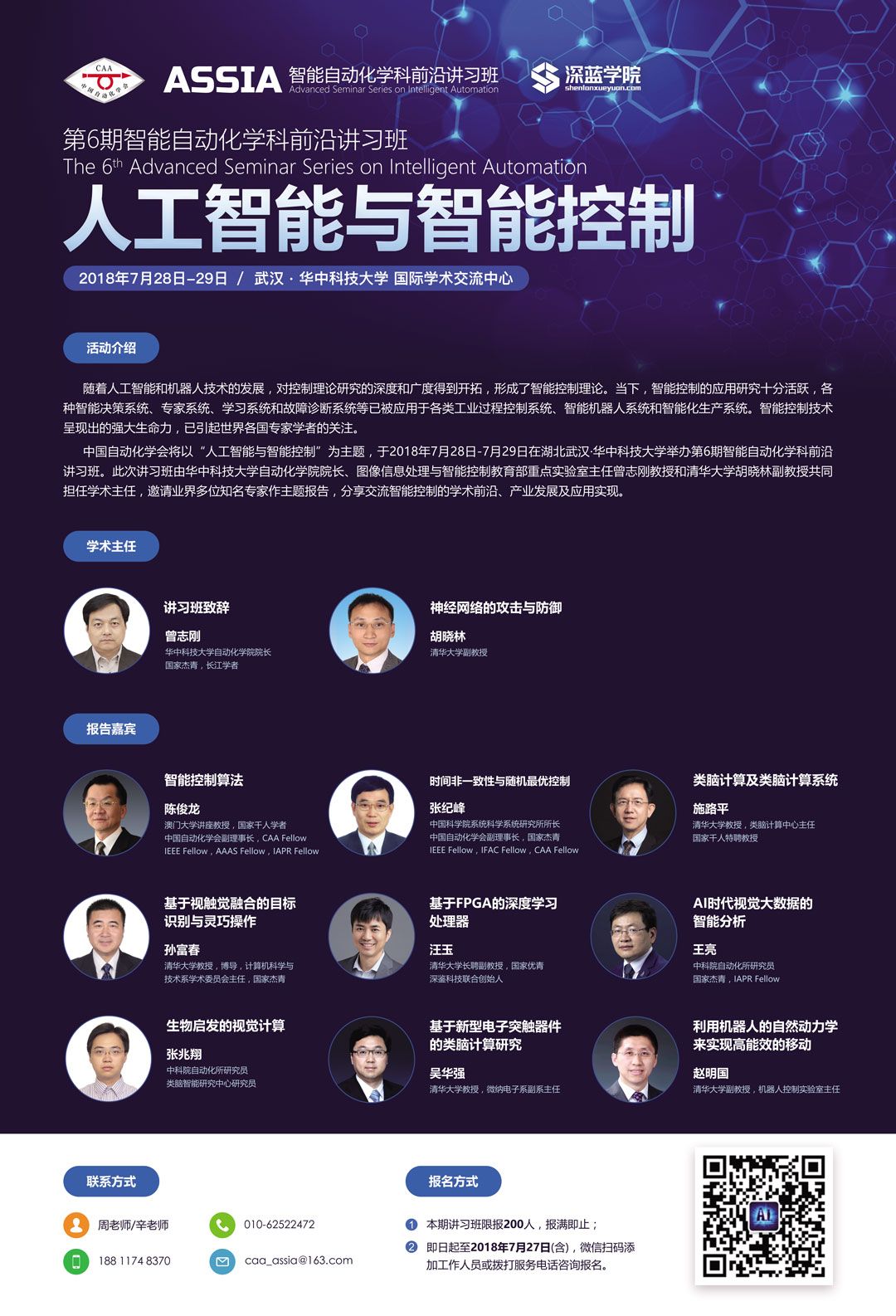 第6期智能自动化学科前沿讲习班于2018年07月28日-07月29日在武汉华中科技大学召开。本期专题关注的主题是“人工智能与智能控制”。