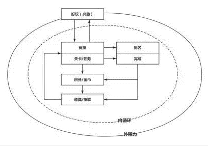 3.排名/完成:中心力。中心力的产生其实就是用户在通过排名和完成任务实现自我,所以会产生最强的需求动力,形成整个内循环的中心动力,等于是心脏部位。跟他人竞技,就是跟他人比拼、比较,完成挂卡和任务其实就是跟自己比较或跟游戏规则制定者比拼,完成同样也实现自我。