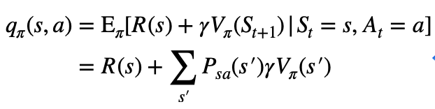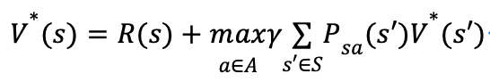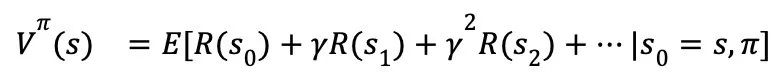 上面的等式称作贝尔曼方程(Bellman equation),从贝尔曼方程可以看出,当前状态的回报的期望包括两部分:1)当前状态的立即回报,2)后续状态的回报的期望和与折扣因子之积。