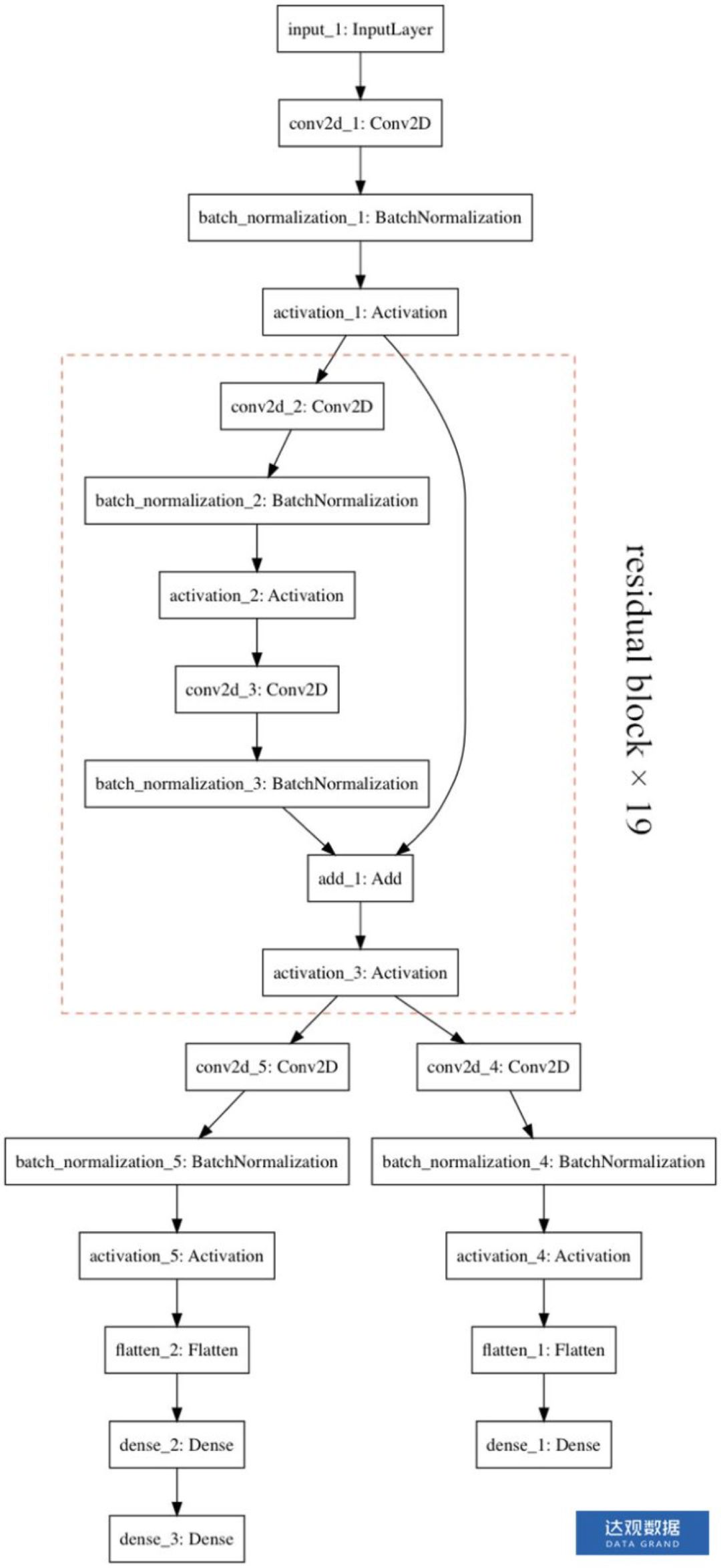 ,输出值函数的分支称之为值网络(Value network),输出策略的分支称之为策略网络(Policy network)。在之前的版本中,值网络和策略网络是两个同架构但分立的网络,在AlphaGo Zero中,这两个网络合并成一个网络。
