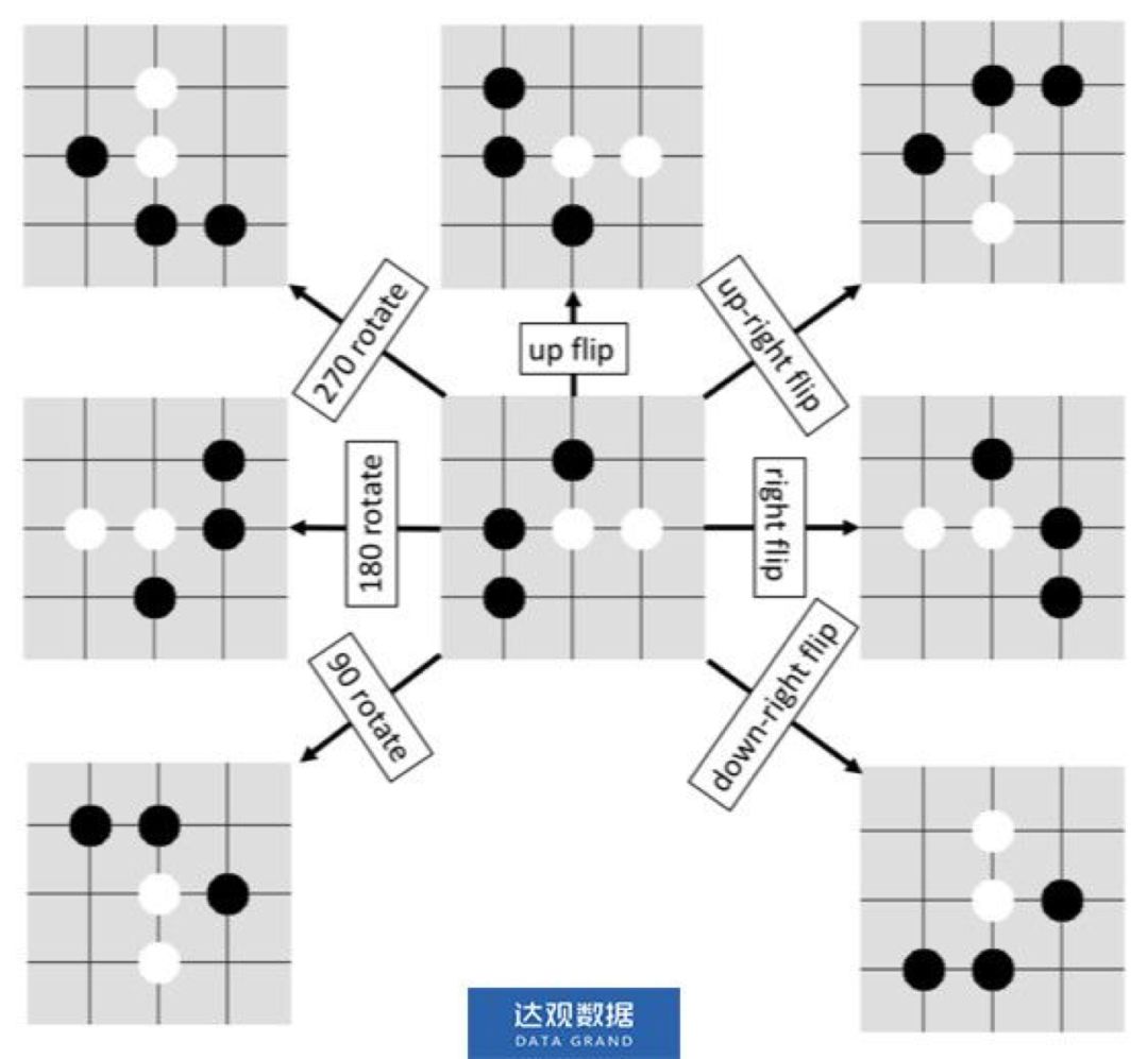 棋盘有 7 种不重复的旋/翻转变换,分别是:上(下)翻转,右(左)翻转,右上(左下)翻转,右下(左上)翻转,90度旋转,180度旋转,270度旋转。90度旋转可以通过右下翻转+上翻转来实现,180度旋转可以通过上翻转+右翻转来实现,270度旋转可以通过右下翻转+右翻转来实现,因此,只需要实现4个基础的翻转变换。在估计叶节点的值函数和各条边的先验概率时,从8种变换中随机地取一个对叶节点进行处理,并对策略网络的输出做相应的反变换。