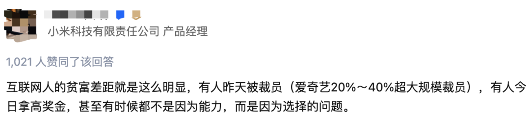 「互联网人的贫富差距就是这么明显,有人昨天被裁员(爱奇艺20%~40%超大规模裁员),有人今日拿高奖金,甚至有时候都不是因为能力,而是因为选择的问题。」