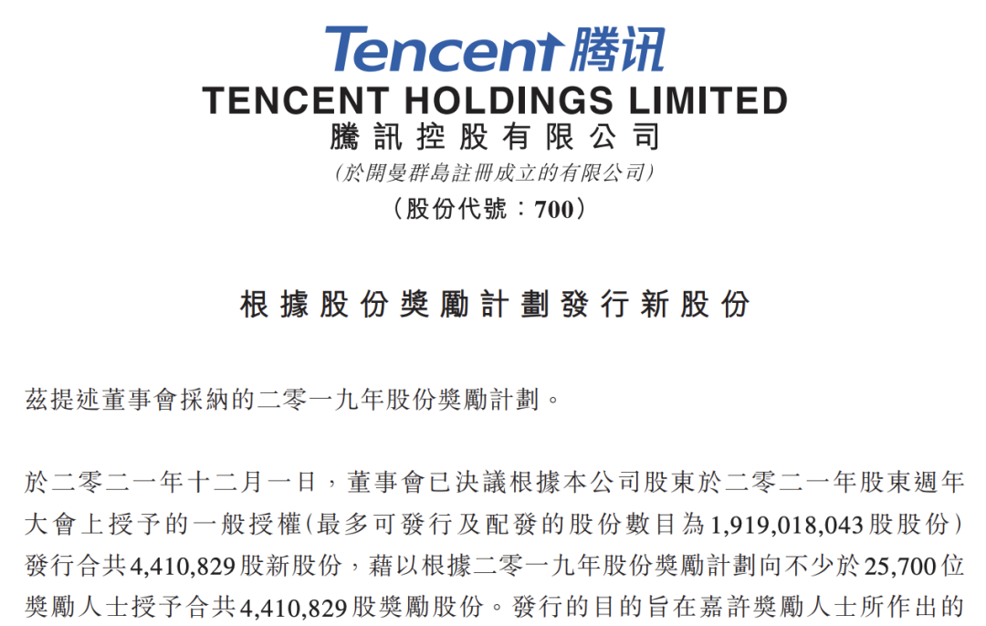 12月1日晚,腾讯控股发布公告,公司董事会已决议向不少于25,700位奖励人授予合共4,410,829股奖励股份。