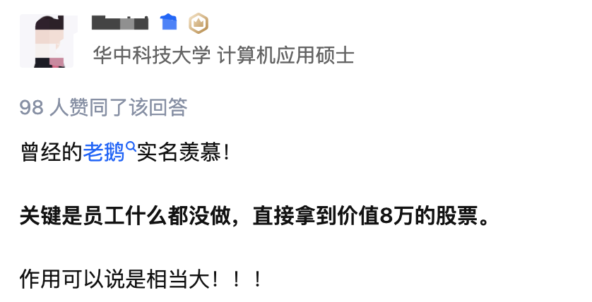 曾经给鹅厂打工的员工表示,「关键是员工什么都没做,直接拿到价值8万的股票。作用可以说是相当大!!!」