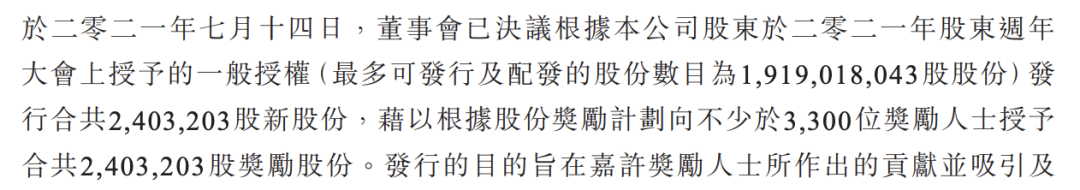 7月14日,腾讯控股在港交所发布公告,董事会已决议发行合计约240万股新股份。根据股份奖励计划,拟向不少于3300位奖励人士授予共约240万股奖励股份。