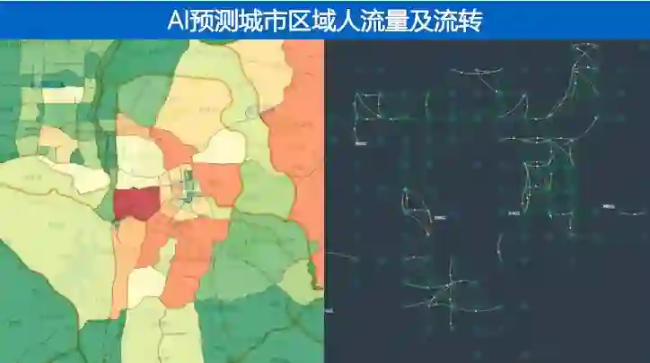 通过大数据和算法,我们能够预测整个城市里每个区块的人流量情况。比如踩踏事件,如果能够提前几小时知道这个区域里未来有多少人进、出,就可以提前管控做分流,保证人身安全。以前的算法很难实现这种非规则区域的人流量预测,大家知道如果做深度学习,只能做规则网格的计算机运算,京东城市做的是在非规则区域里做人流量预测。另外还能够做到不同区域之间,人流量之间的转移,在源头上进行分流。这样既能保证公共安全,也能帮助我们做很多的智能的调度和管控。