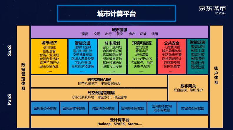京东城市打造的城市计算平台,是在云计算能力基础之上,由时空数据管理层、面向时空数据的AI层、应用层等多个板块构成的一款产品。城市计算平台通过将数据标准化、算法模块化,可以高效支撑跨多个领域的垂直应用,涵盖城市经济、智能交通、城市规划、环境与能耗、公共安全和智能政务等领域,并精准勾勒出城市里人口、消费、出行等多方位城市画像。值得一提的是为了打通用户间的数据壁垒,打造了一个叫做数字网关的特殊模块,此模块基于隐私保护,具备很强的跨越数据建模能力。