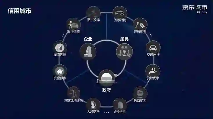 建设社会信用体系是完善我国社会主义市场体制的客观需要。但目前覆盖全社会的征信系统尚未形成,信用标准规范模糊;同时,激励和惩戒机制尚不健全,居民的诚信意识薄弱,为整顿和规范市场经济秩序带来了诸多挑战。京东城市突破传统的仅针对个体的独立信用模式,为个人、企业、城市管理部门三大城市信用主体提供顶层信用城市解决方案,打通各主体之间的数据壁垒,并针对不同信用场景设计独特的机器学习算法,实现对城市信用肖像完整的刻画。在信用地图用了5组数据,20多个维度的特征来计算这个信用,但是这5组数据的权重是通过人工智能自动算出来。不是人定的,每个数据的权重都不一样。人工智能不是一个简单可视化,而是用数据、用算法去决定它的权重。