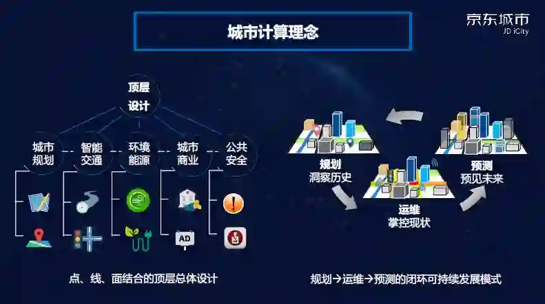 城市计算对数据不断收集、管理、分析和挖掘,并用挖掘出来的知识解决行业里的痛点,是大数据、云计算和人工智能在城市场景里的有机融合。京东城市的理念包括两个方面,第一个提供点、线、面结合的顶层总体设计;第二个,城市在不断发展和变化,方案不能是静态的,一定随着城市的发展在规划、运维和预测中不断的迭代,通过预测进一步指导未来的规划,可以从规划到运维到预测的闭环实现可持续发展。