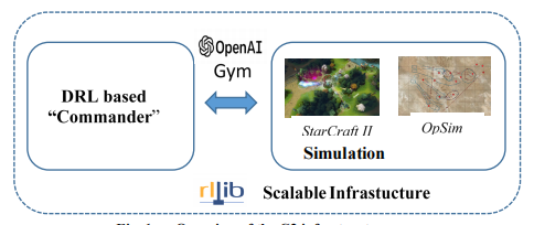 作为该项目的一部分,我们开发了C2模拟和实验能力,包括与基于DRL的人工智能算法和国防部高性能计算系统上的可扩展RL的接口的模拟战斗空间(图1)。我们使用两种模拟环境来生成C2场景:星际争霸II学习环境(SC2LE)29和OpSim。虎爪,一个由卓越机动中心(Fort Benning,Georgia)开发的场景,在模拟环境中生成了真实的战斗环境。最后,我们使用RLlib31,一个为RL提供可扩展软件基元的库,在HPC系统上扩展学习。