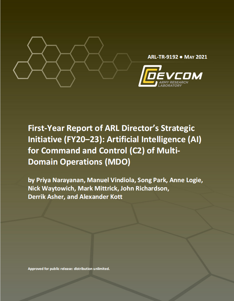 该项目第一年的重点是开发研究的基本构件,包括:1)通过调整和使用基于《星际争霸II》和OpSim的环境来开发模拟能力和高级界面;2)开发执行C2功能的初始端到端人工智能;3)通过与高性能计算(HPC)环境整合来开发计算能力;4)初步确定数据量和训练要求。本报告提供了这些任务中每个任务的细节。