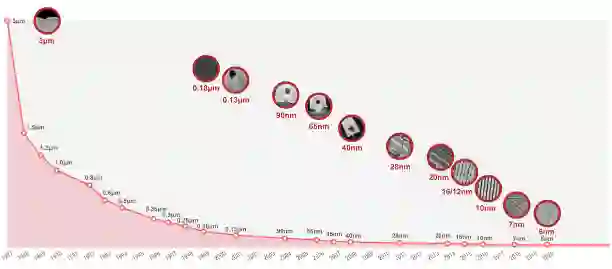 根据摩尔定律,制程节点将以大约0.7倍递减,从0.8μm、0.5μm、0.35μm、0.25μm、0.18μm、0.13μm、90nm、65nm、45nm、32nm、22nm、16nm、10nm、7nm,一直发展到现在的5nm,未来的3nm都是如此。在正常「全」节点中间,还出现一些「半」节点制程,如28nm、20nm、14nm。