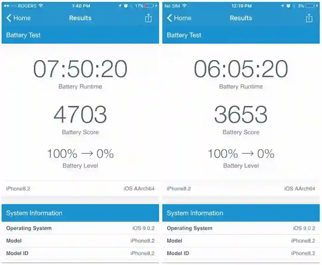 台积电(左)和三星(右)在iPhone 6s Plus上的Geekbench电池测试