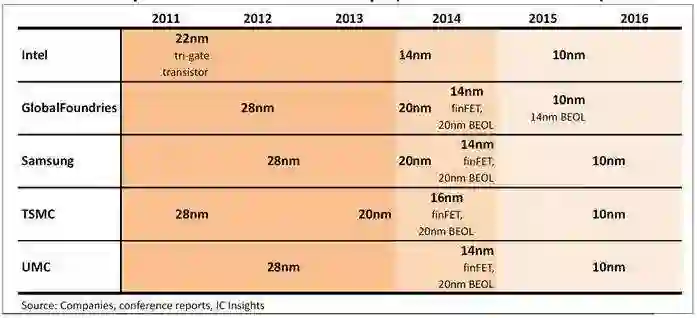 然而,到了2014年,转折点出现了。此时,Intel实现了14nm制程量产,而台积电也在一年之后完成了16nm的制造。