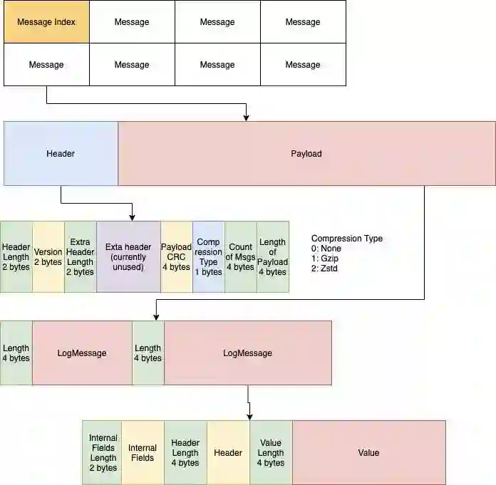MemQ 的最低传输单位被称为 LogMessage。这类似于 Pulsar Message 或 Kafka ProducerRecord。