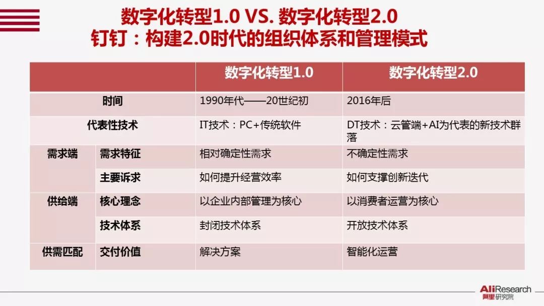 一是从技术体系看,实现从IT到DT转变。数字化转型1.0是基于传统架构+桌面端;数字化2.0是云管端+AIOT等为代表的新技术群落。技术架构体系的背后是系统开发流程、逻辑、工具、方法的迁移,以及商业模式的重构。钉钉的基因天然的是面对角色、面向场景+基于云+基于移动,这是钉钉与传统软件的本质区别。