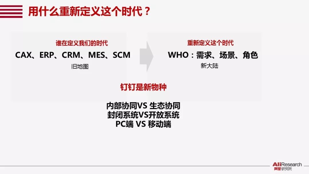 IT时代有一套基础管理的软件体系,办公系统(OA)、财务管理、人力资源管理、客户关系管理(CRM)、企业资产管理(ERP)等。钉钉是什么?钉钉是搭建了一个平台,通过合作伙伴把办公(OA)、客户关系管理(CRM)、企业资源管理(ERP)的一部分功能切下来,放到一个平台上,这个平台上有各种与人的高频交互的功能,但从传统IT视角来看功能都不全面。钉钉软件功能的开发,不是基于流程,而是基于场景、基于需求、基于角色。事实上,钉钉正在重新定义软件的功能模块。
