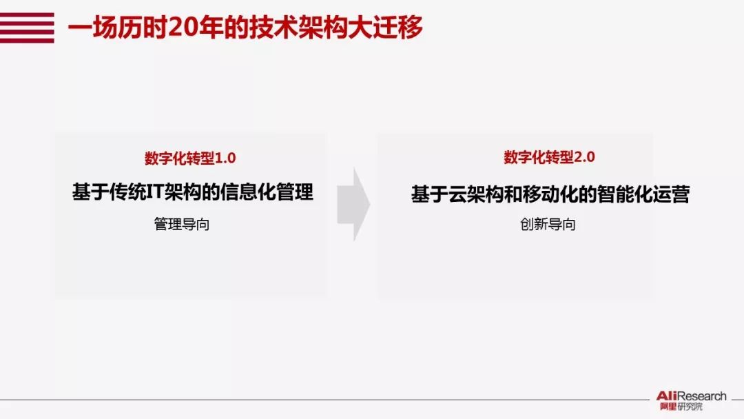 数字化转型1.0:面对商业系统的复杂性,过往30年所形成的传统IT架构、以及基于这套架构所形成的解决方案,越来越难以适应商业系统复杂性需求,对需求响应的周期、成本、效率难以满足客户的需求,我们把这一基于传统IT架构的解决方案定义为数字化转型1.0,它是基于管理导向。今天数字化转型1.0仍处于主导地位。