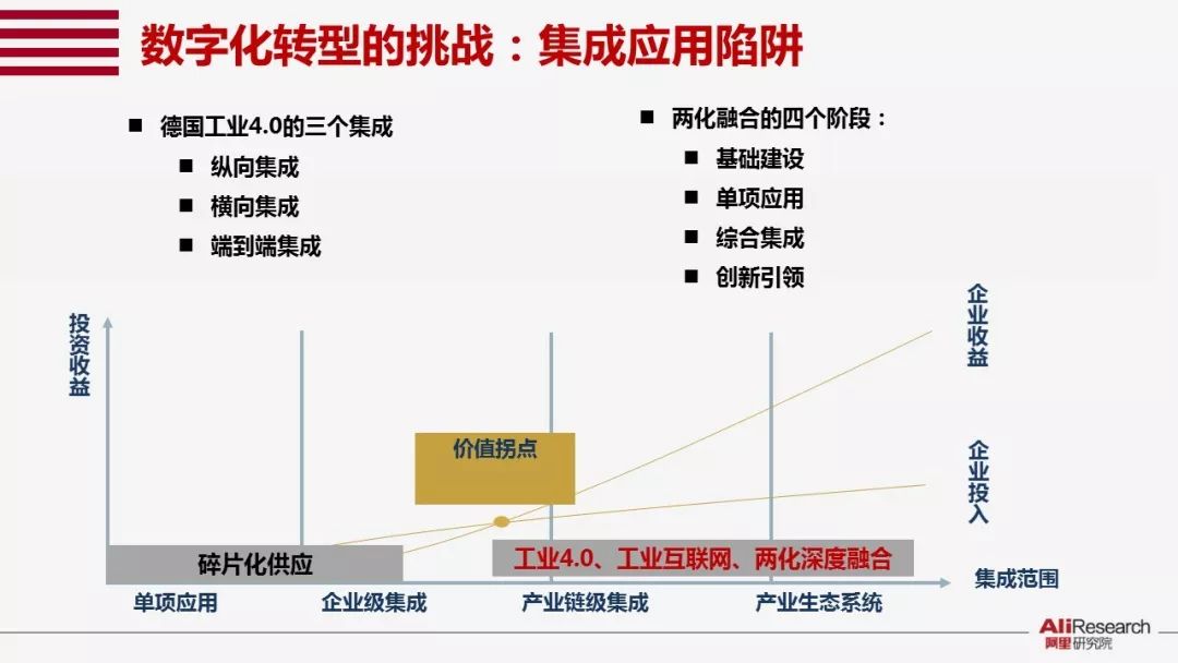 五年前我曾经创造了一个词——“集成应用陷阱”,“陷阱”这个概念来自“中等收入陷阱”,当一个国家人均GDP从1万美元跳跃到3万-4万美元的时候,跳不过去,这叫做“中等收入陷阱”。在企业数字化转型进程中也面临同样的问题。企业从财务管理、客户关系管理、企业资源管理、供应链管理等单项应用,跳跃到全流程、全场景、全生命周期应用,非常困难,所以叫做“集成应用陷阱”。
