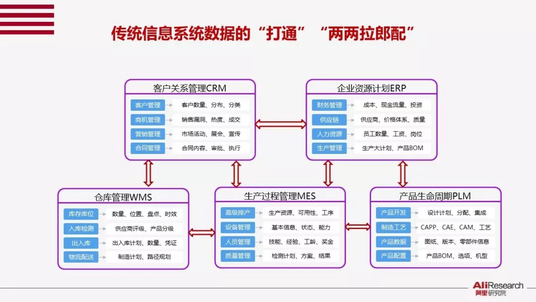 关于渐进路径,人们正通过各种技术手段,通过“两两拉郎配”的方式,实现传统信息系统数据的“打通”,正像德国工业4.0所要追求的横向集成、纵向集成和端到端集成,两化深度融合所要实现的管控衔接、产销集成、业财无缝等。可以预期,在相当长的时间内大部分的业务系统的集成是通过传统业务系统打通实现的。这是数字化化型1.0。