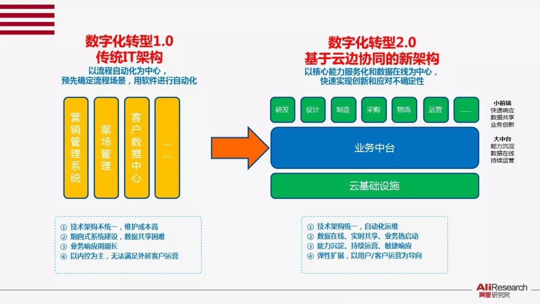 数字化转型2.0:面对商业系统的复杂性,业界正在构建基于云边协同的解决方案和新的技术体系,我们称之为数字化转型2.0,数字化转型2.0是基于创新导向。数字化转型2.0要处于主导地位,或许还需要5-10年左右的时间。但毋庸置疑,或旧或晚,这一天总会到来。这一进程的快慢,取决于新架构体系的成熟度,也取决于市场竞争在多大程度上会倒逼企业技术架构切换力度。