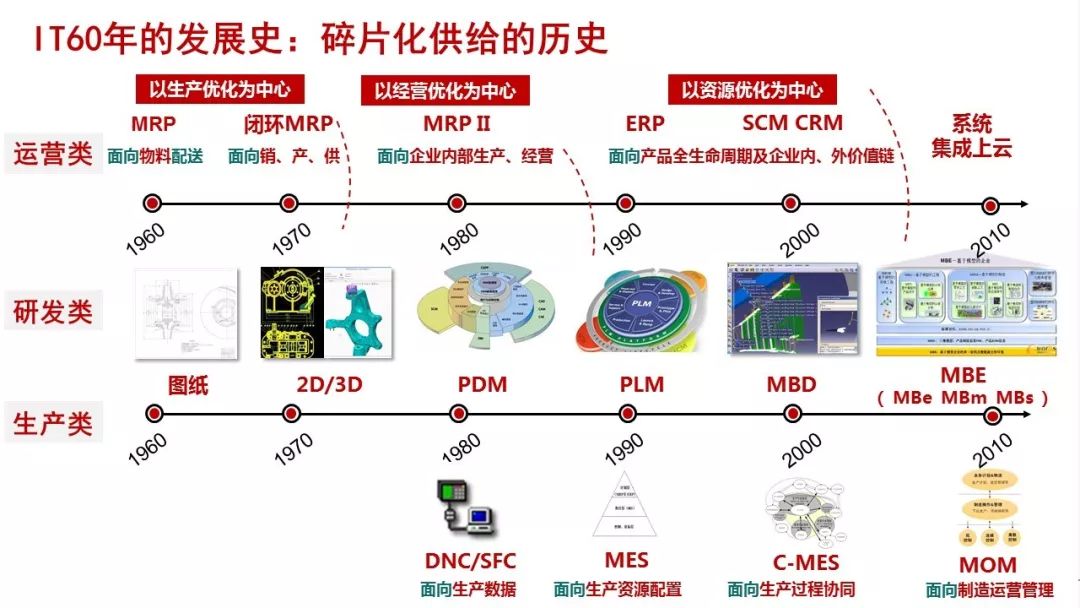 从经营管理来看,我们回顾一下ERP的发展史,50年前人们思考的是仅仅是如何解决物料相关的问题,后来演进到产供销协同,再到企业内部经营管理(ERP);从研发数字化看,我们回顾一个产品全生命周期管理,伴随着研发工具从基于图纸、二维(2D)、三维(3D)到基于模型的企业(MBE)等演进,研发实现了从对单一零部件、整机管理到产品全生命周期的数字化管理;从生产环节来看,从过去关注单机设备、单一生产线再到整个制造运营体系的效率提升。