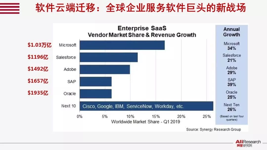 2019年一季度,全球云端企业级市场(面向企业的SAAS服务市场)分别是微软(市值1万亿美元)、Saleforce(市值1196亿美元)、Adobe(市值1492亿美元)、Sap(市值1657亿美元)、Oracle(1935亿美元)。在美国,云端2B数字化服务市场有几万亿美元市值的公司,而在中国的这一市场上,市值最大的是哪家公司,这一领域的企业市值总和有多大?有机构统计,在SaaS领域美国企业获得了全球70%的融资,中国只有11.7%;中国数字化市场上2C与2B的上市公司市值之比是20:1,如果能达到像美国的6:4,那基于云端2B数字化市场将是一个超级蓝海。