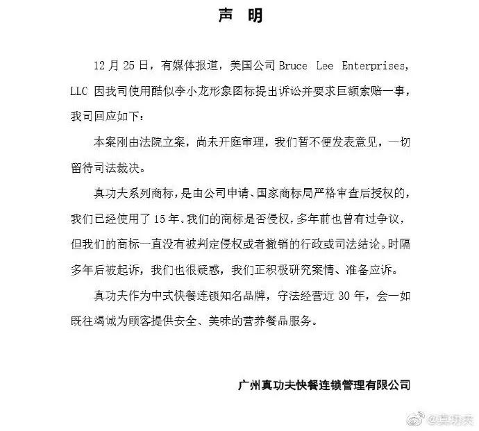 12月25日,据报道,真功夫餐饮因为使用酷似李小龙形象图标用作商标,被李小龙公司诉至上海二中院,索赔经济损失2.1亿元,以及维权合理开支8.8万元。