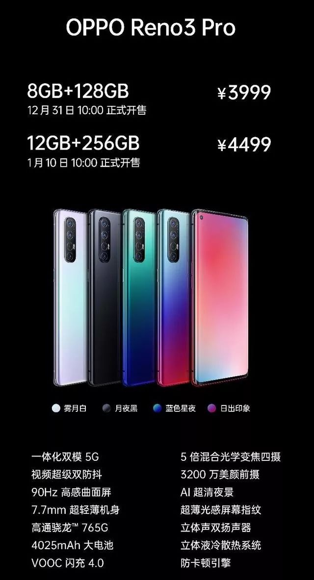 8GB+128GB版本的Reno 3售价为3399元起,12GB+128GB版本的高配版本售价为3699元;