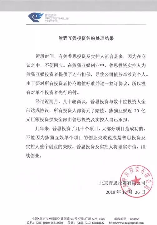 12月26日消息,熊猫互娱投资人否认已获王思聪赔偿:未参加谈判,会继续追究。此前,普思资本发布公告《熊猫互娱投资纠纷处理结果》表示,经过近两月,几十轮商谈,普思投资与数十位投资人全部达成协议,所有投资人都得到了赔偿,熊猫互娱近20亿元巨额投资损失全部由普思投资及实控人自己承担。