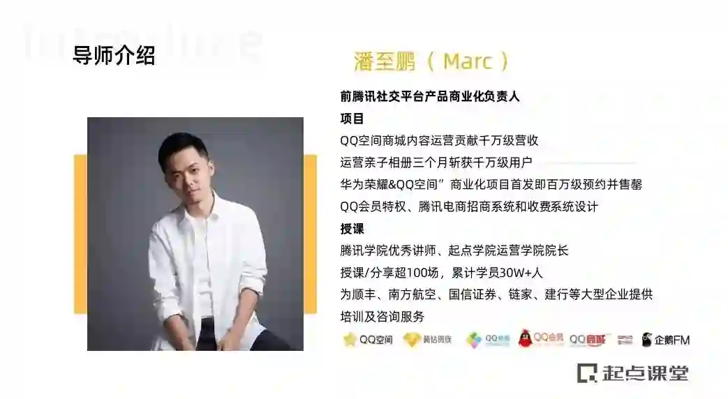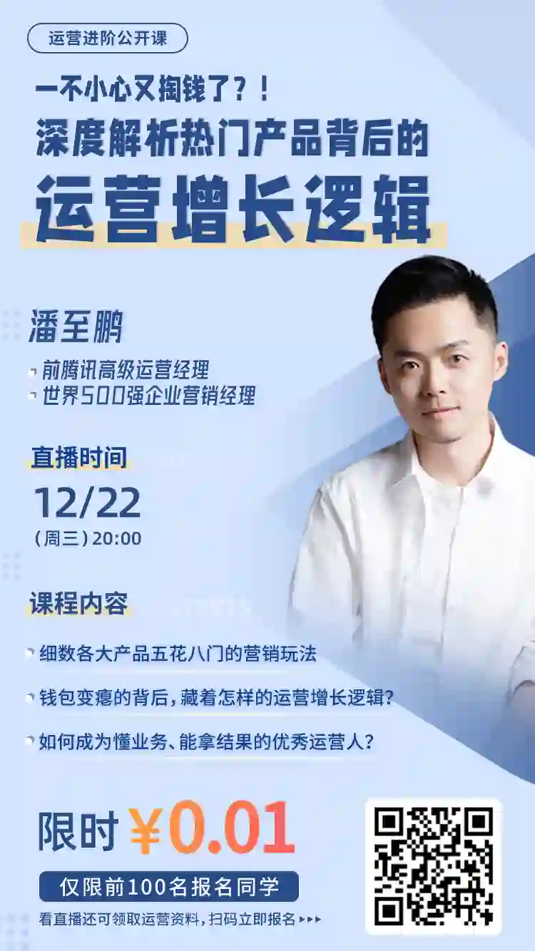 本次公开课由前腾讯高级运营经理、世界500强企业营销经理@潘至鹏老师授课,潘至鹏老师先后在多家BAT大厂供职,创造过多个百万级流水的营销活动,对运营有着自己独到的见解。