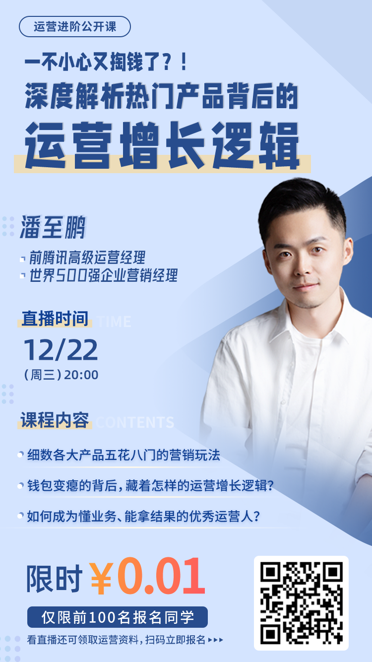 潘至鹏老师在直播课程将会告诉同学们成为一名懂业务、拿结果的优秀运营人的方法,给同学指引方向!