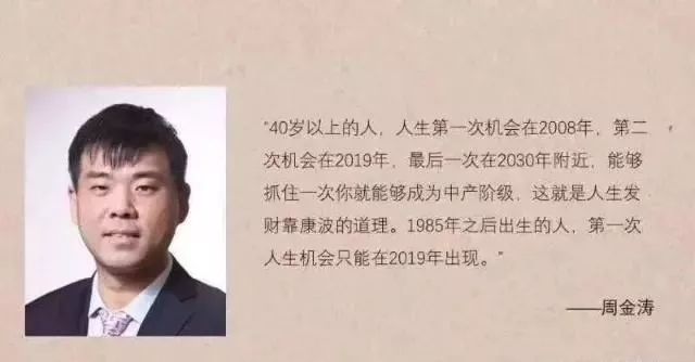 最后一句是周先生的话:“40岁以上的人,人生的第一次机会在2008年,第二次机会在2019年,最后一次在2030年附近,能够抓住一次,你就能成为中产阶级,这就是人生发财靠康波的道理。